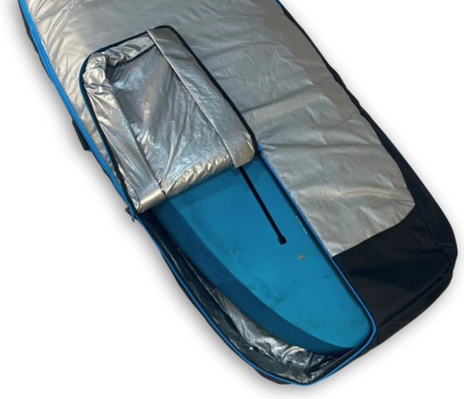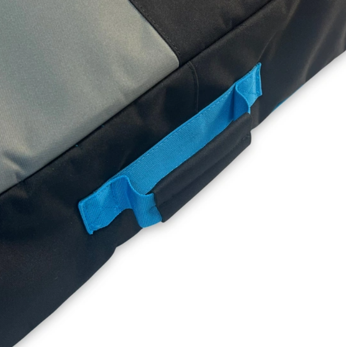 The interior and bottom of the bag are lined with Silver Tarpee, a highly tear-resistant material that shields the bag from cuts and abrasion caused by sharp board edges. A 5 mm PE foam layer cushions the board and absorbs impacts during transit. On the outside, durable 600D black PVC provides a robust, weather-resistant barrier that holds up to repeated use and UV exposure.